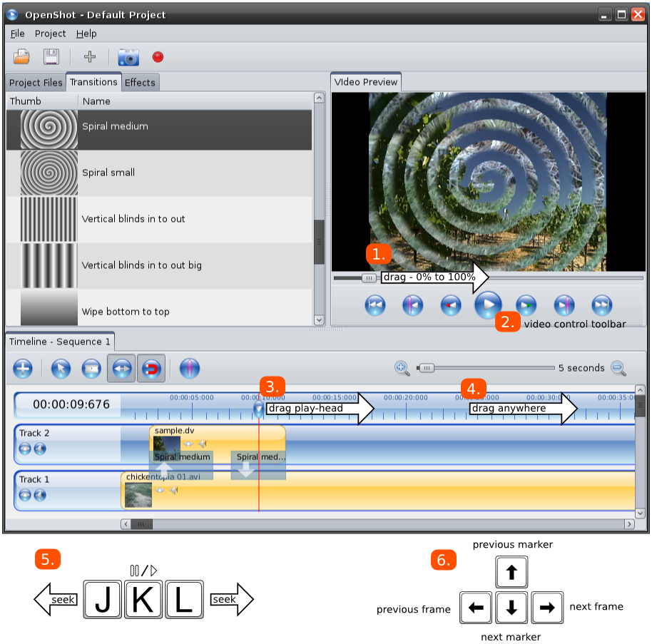 • Dragging the slider under the video preview (this is % based). This will always let the user quickly seek from the beginning of the video project to the end (i.e. from 0% to 100%)